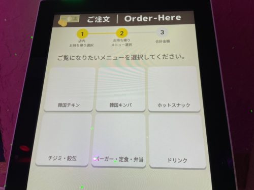 厨房の横にどでかいタッチパネルがあり、ここで商品を選んで、注文するかたちになります。