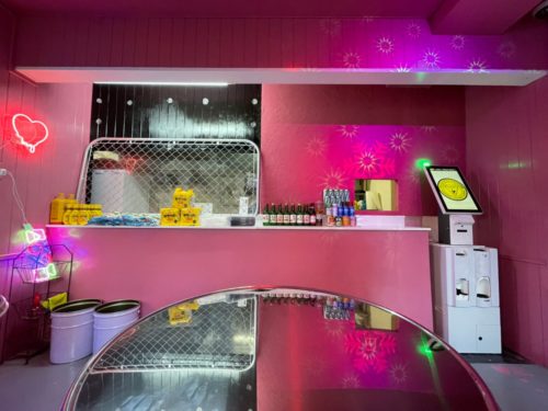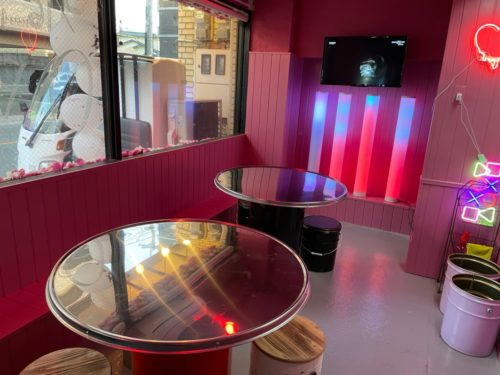 どこもかしこもピンクで、とってもファンシーな店内です。こちらの内装は、スタッフさんたちがDIYで作られたそう。