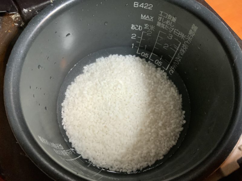 ご飯を洗い、水を普通に炊く時と同じ量入れます。