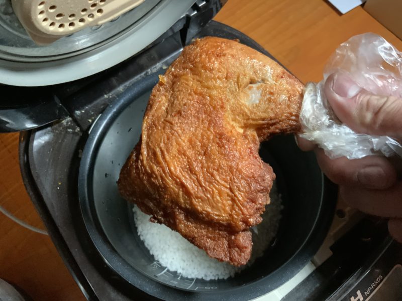 余分に買っておいた矢部のケンチキを食べながら炊きあがりを待ちます。