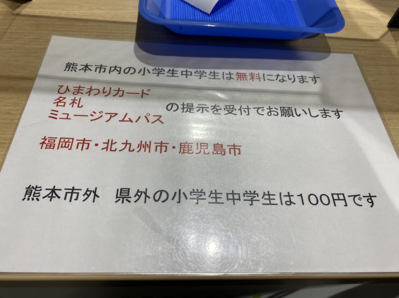ちなみに熊本市内の小中学生は無料になるので、お子さん連れて行く場合にはひまわりカード、名札、夏休み前に学校から配布されたであろうミュージアムパス、いずれかの提示が必要です。
