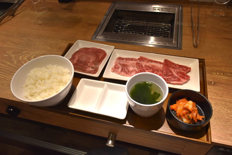 今回は、店長さんおすすめの「牛タン&匠カルビ&ハラミプレート」(150g:税抜1,280円)を注文しました。プレートで注文すると、ご飯、スープ、キムチがついてきます。プレートは、オープンから閉店まで注文ができます。