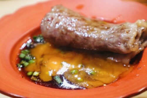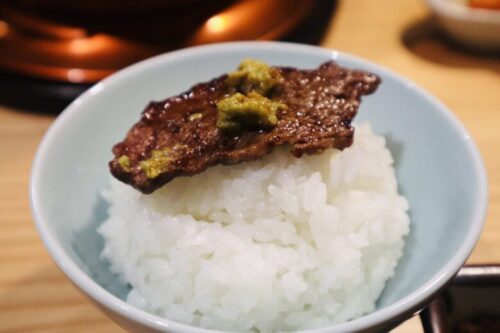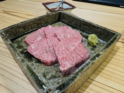 そしてワサビも、どん。とろけるような九州産和牛のお肉はガシガシと噛まなくていい至福の時間。こんなにも美味しいお肉に出会ってしまったら日常生活に戻れなくなってしまうと思うほど。大人になってから(中年)お肉の脂に胃が耐えられなくなることが多々ありますが、こちらのお肉は脂のバランスが素晴らしく、とろけるようでいて、脂こくないのです。