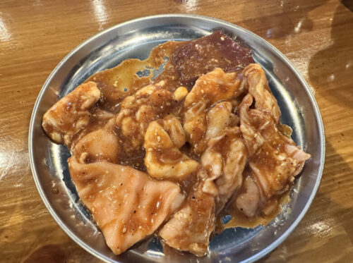 厚切りのカルビとハラミ。自家製タレででてきます。タレなしもできるそうですよ。