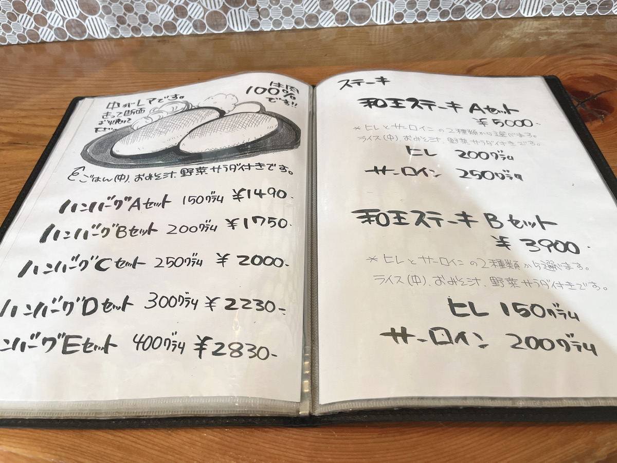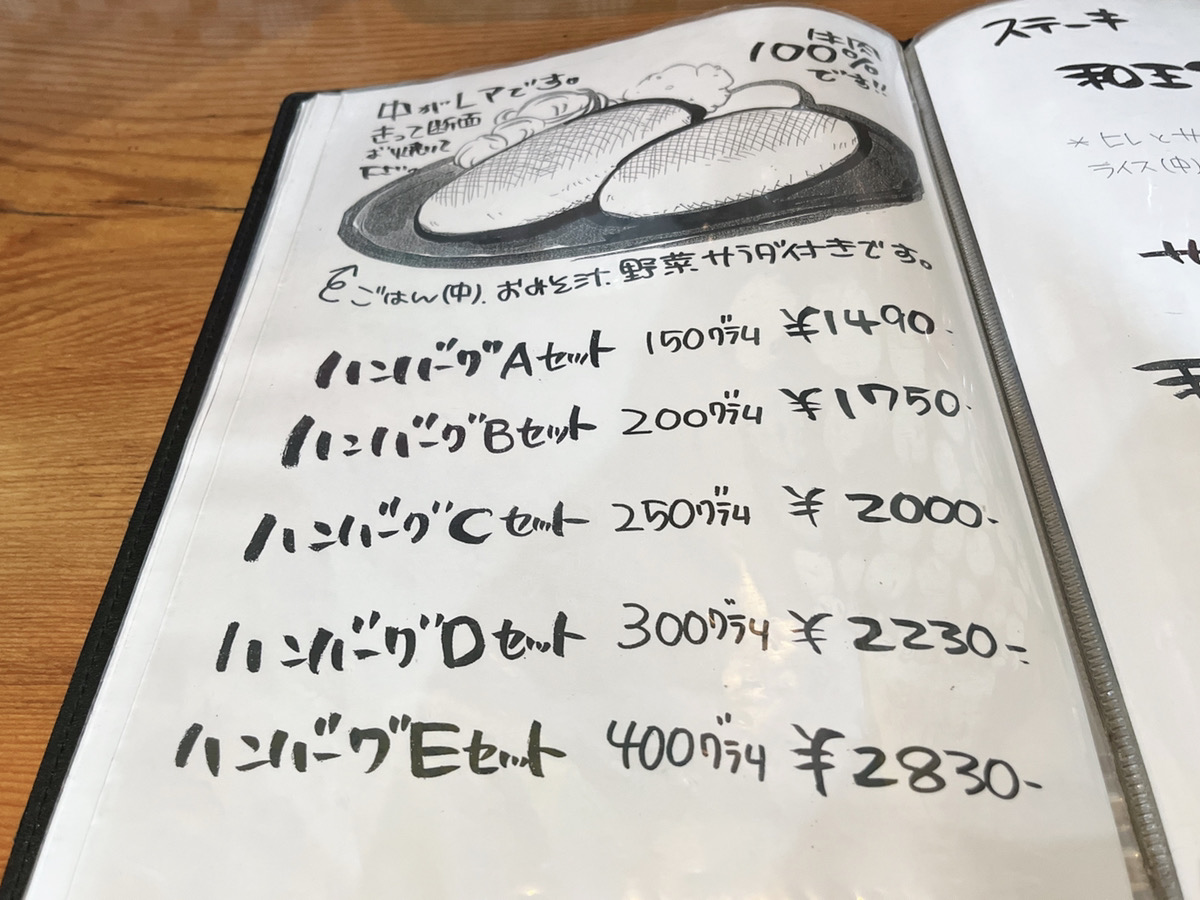 ハンバーグは5種類のセットがあります。グラムが細かく設定してあって、1番人気は200グラムなんだそう。私もハンバーグ200グラムのBセットを注文しました。