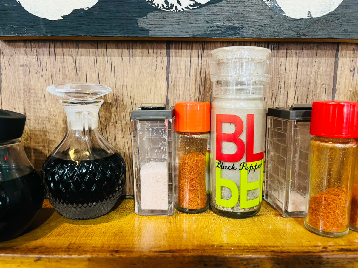別添えでソースが付いてくるんですが、卓上に調味料もあるので味変も可能。