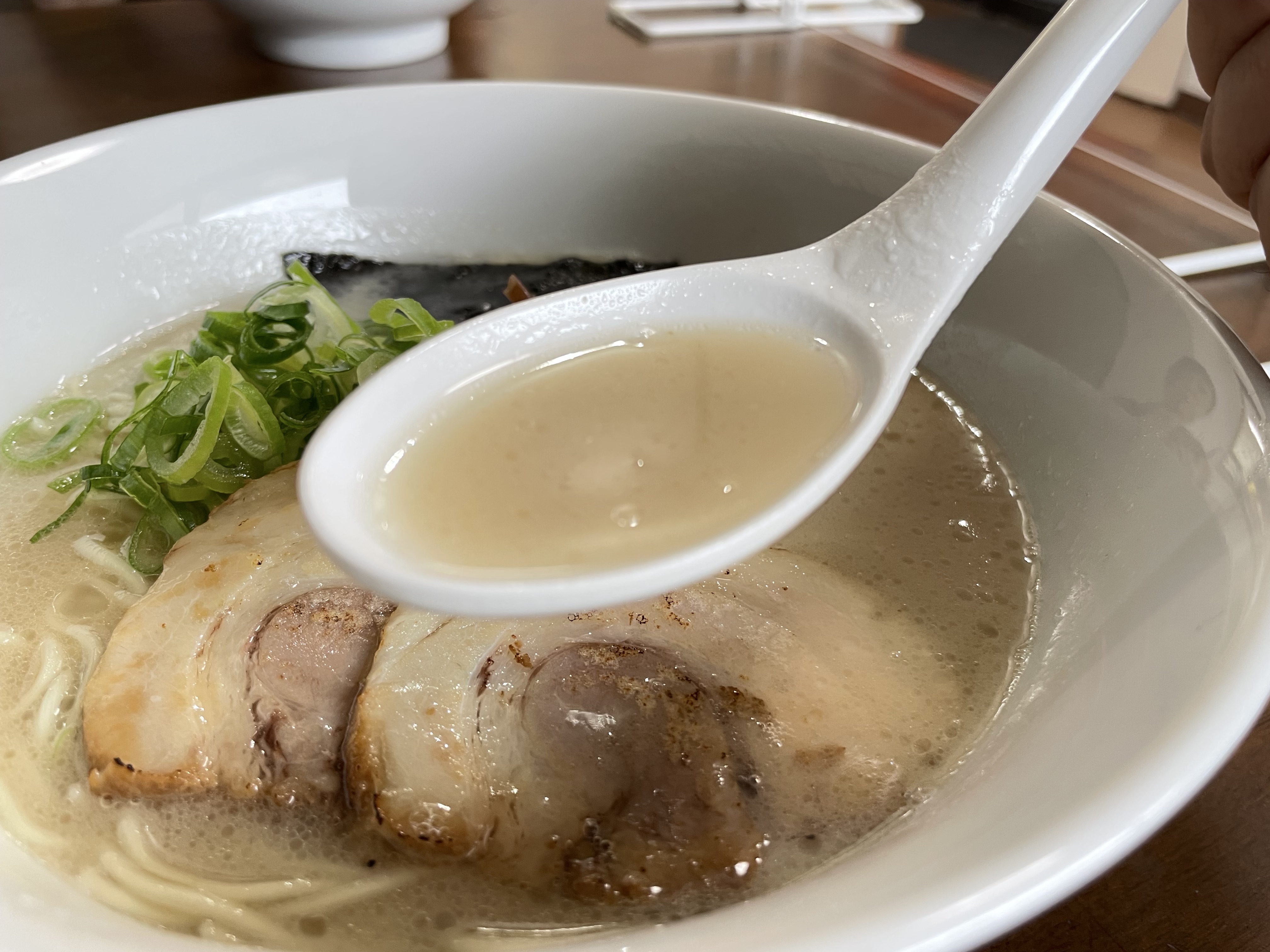 少しとろみがあって、見た目よりも濃厚です。豚骨の匂いが強く、好みが分かれそう。