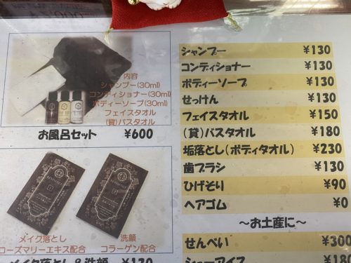 | アメニティ | あり。シャンプーリンス、ボディソープ、ピーリングジェル、ドライヤーは無料貸し出し。タオルは280円で販売 |