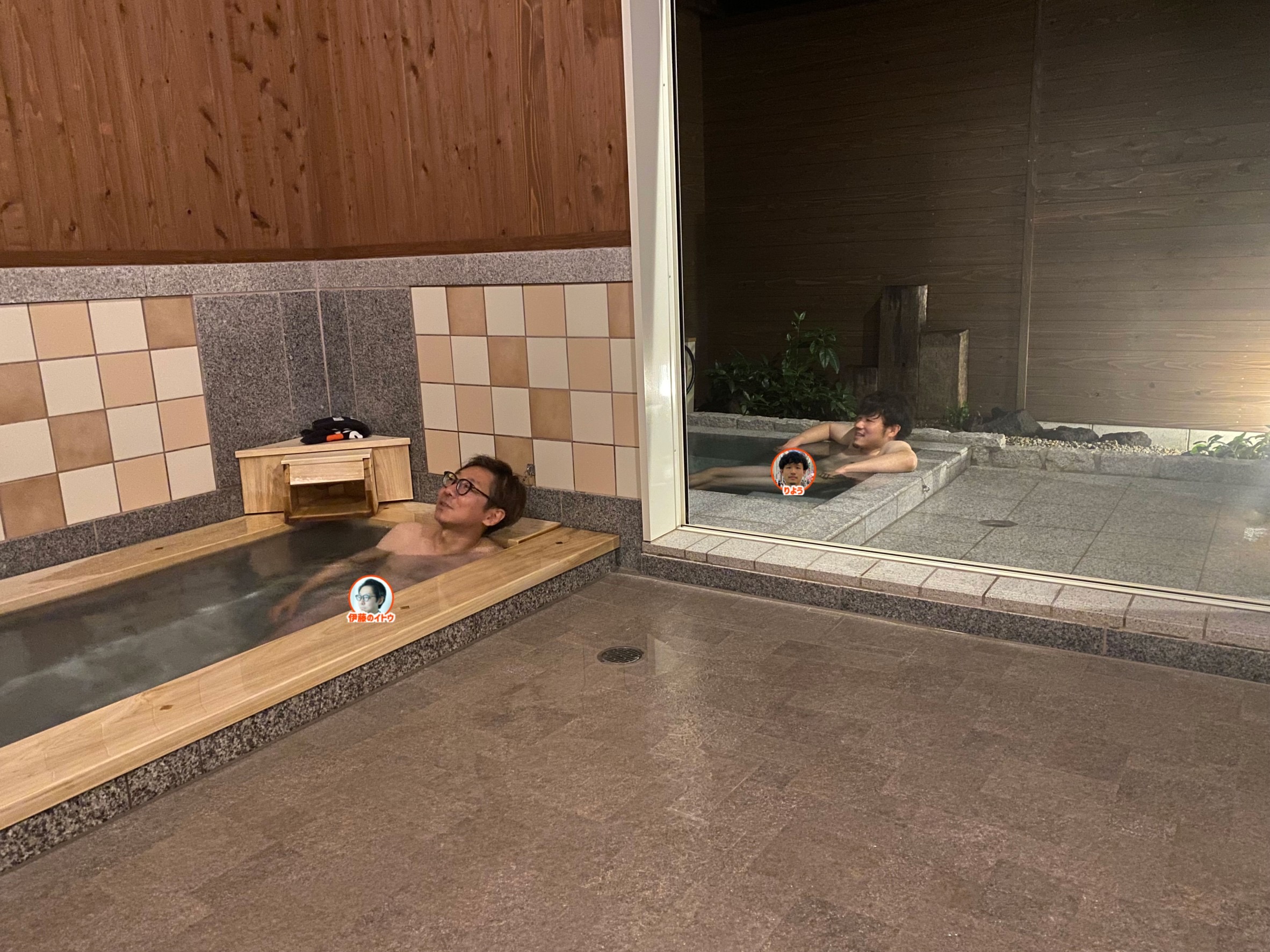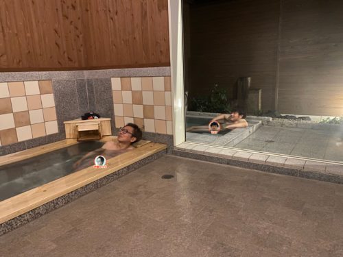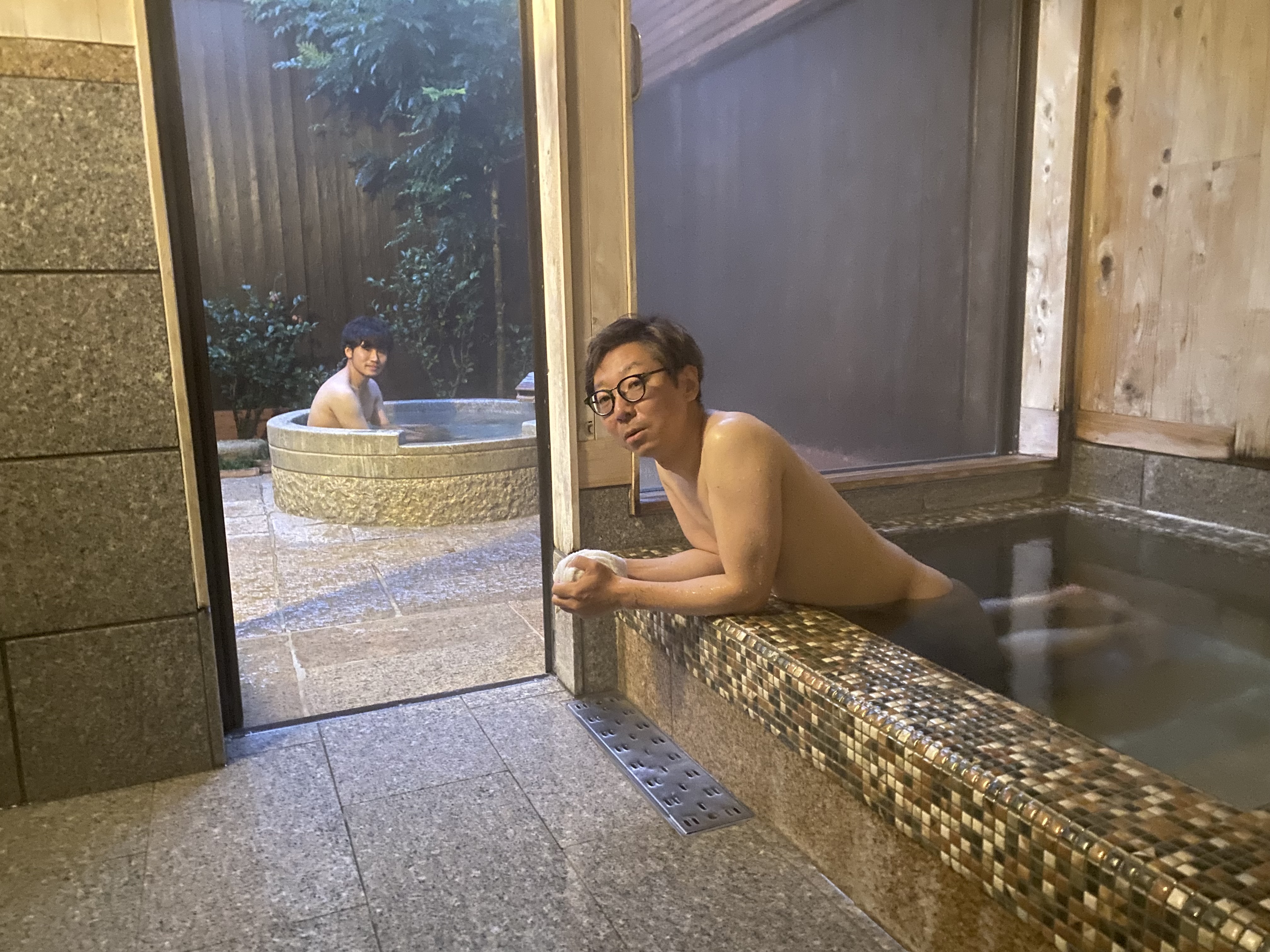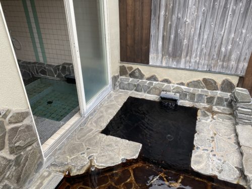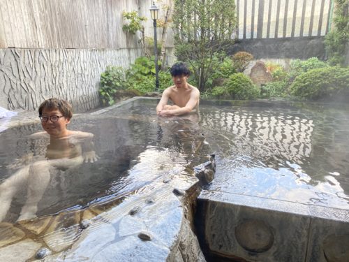 露天風呂は2種類。奥に寝湯があり広々とした温泉で、家族4人で行ってもみんな一緒にちゃぷんできます。