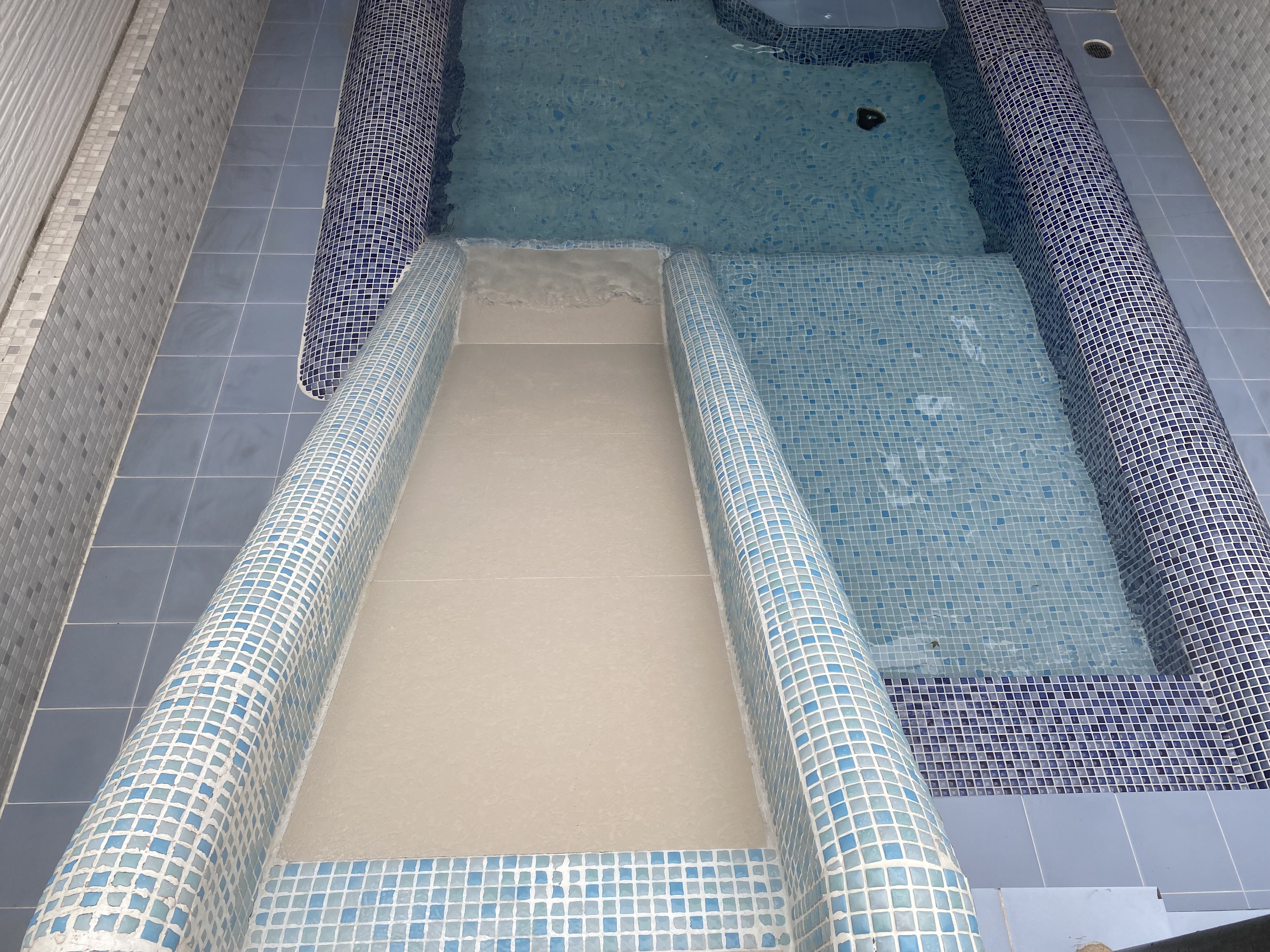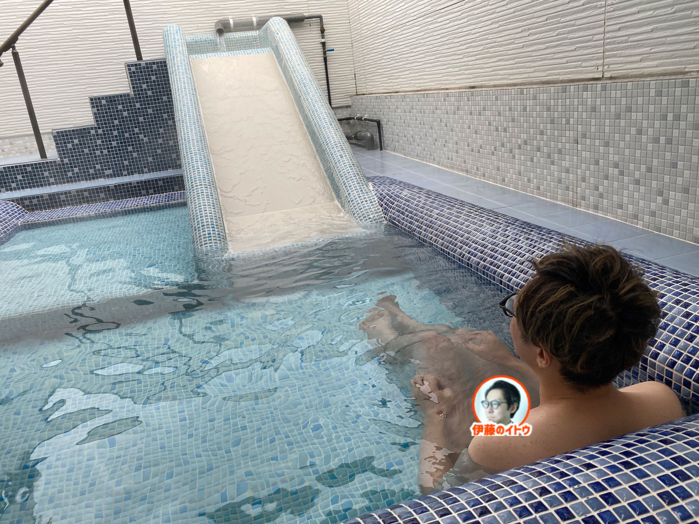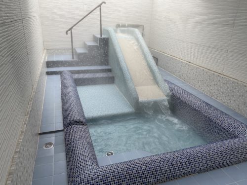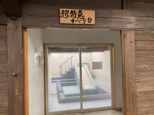 超特急の滑り台は見た目より傾斜があり、勢いよく浴槽に入りますので、小さいお子さんは大人と一緒に滑ってくださいね。