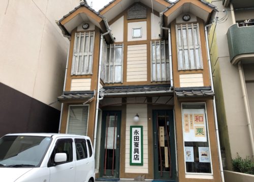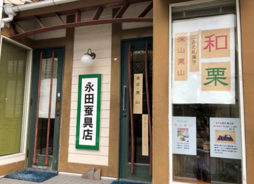「永田蚕具店」という看板が目印。同じ建物内にあるので、迷わず右側の「茶店・栗山」と書いてあるドアの方を開けましょう。お間違いなく。