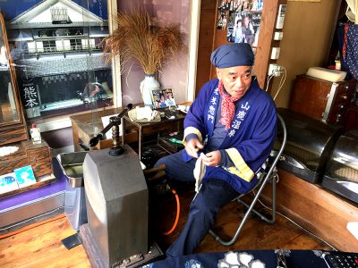 毎日手焼きせんべいを作られて、観光客が初見で来店するたびに、その卓越したトーク力で惹きつけます。