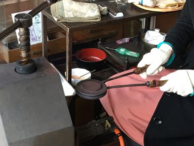 専用の金型に蓋をし専用釜に入れてすばやく芯棒を回します。この米せんべい専用窯は、芯棒を回すと窯の中に入れた金型に圧力がかかる特別な窯なんだそう。
