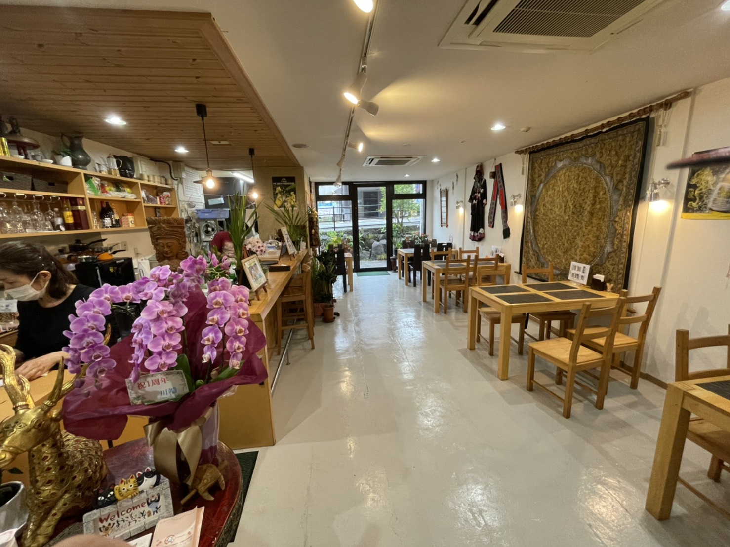 入り口には常連客からの「祝1周年」と書かれた花が飾られ、いつまでも愛されている「シンカム 黄金の獅子」でラオス料理を召し上がってはいかがでしょうか。