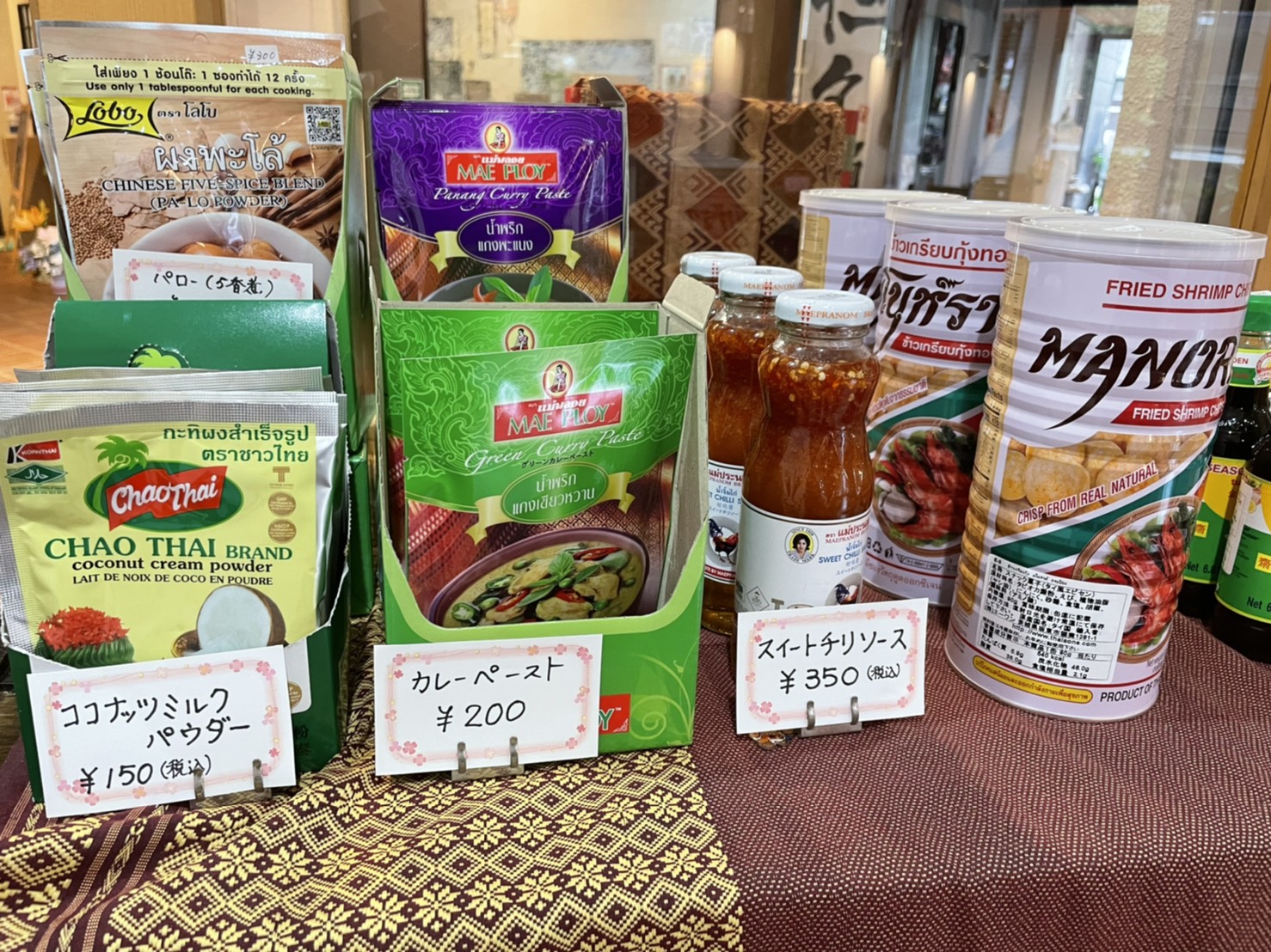 店内に入ると、テーブル席が5席とカウンター席が3席ほどあり、調味料やタイのえびせんなどのお菓子も販売していました。