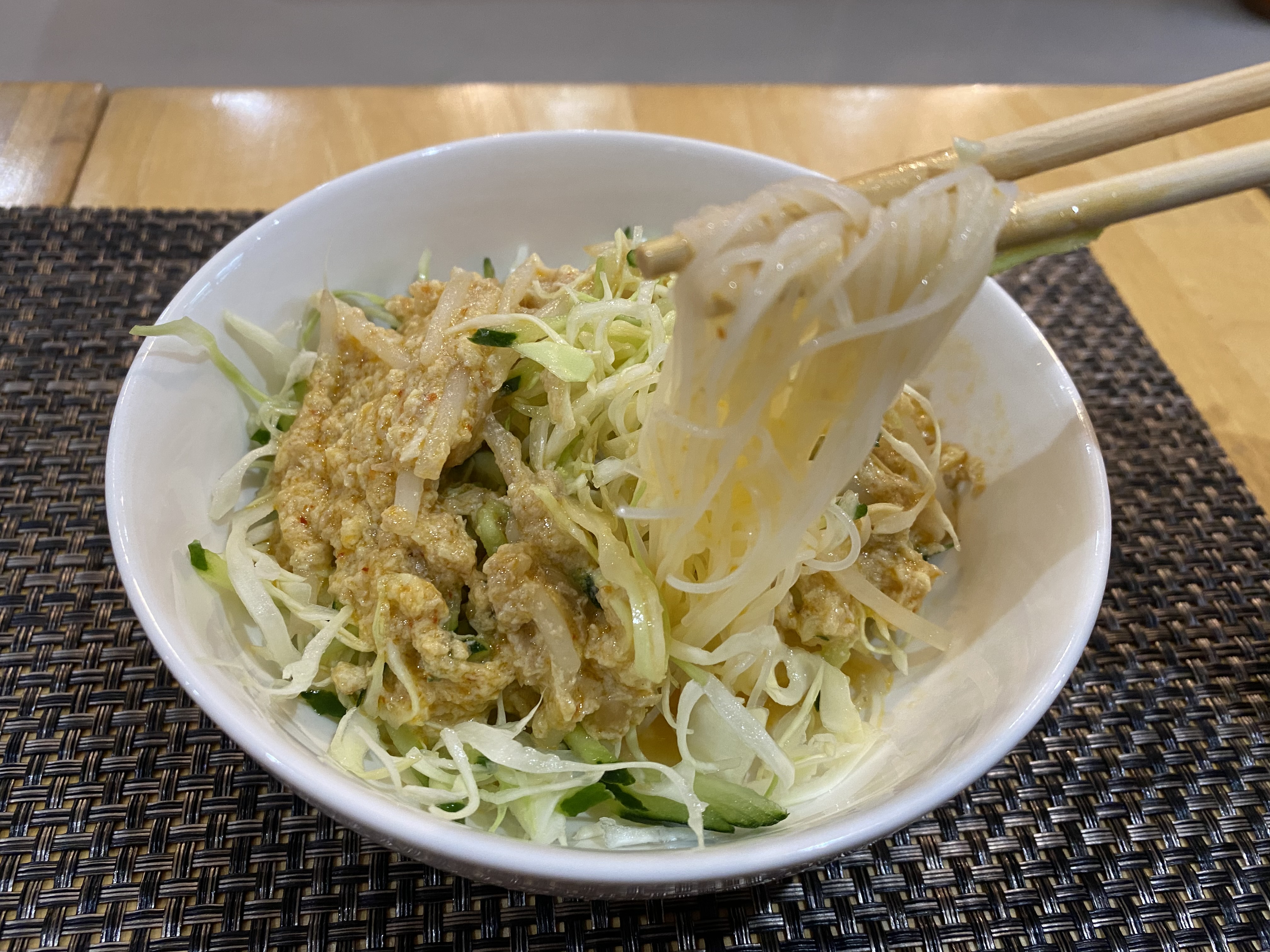 カレーセットの前菜「ミーカティ」フォーと野菜の上に特製ソースがかかったものです。特製ソースはココナッツの優しい味。