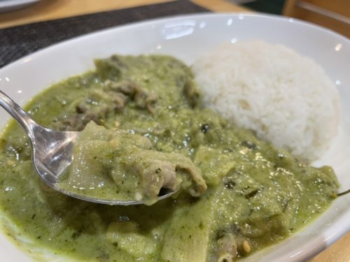 メインのグリーンカレーは、口に入れた瞬間、ふわっとココナッツが香り、練りこまれたホウレンソウが程よく青唐辛子のカラさを抑えています。