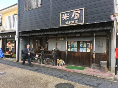 こちらのお米屋さんも、歴史ある地域の米屋さんです。建物は、一般で見かけるガラスサッシの入り口ではなくて、昔の古い木造の建物に上手に手を加えて、かつての山鹿の雰囲気を維持する建物となっています。