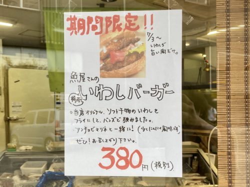 期間限定のいわしバーガーもありました 。期間は、7/3~いわしが旨い間だけ、とのこと。