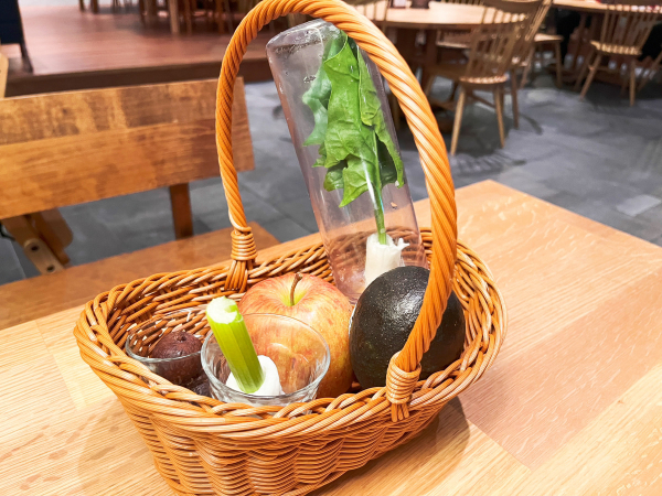 ハンバーグを注文すると、月替わりの手作り野菜ジュースを出してくれます。先ほどの野菜は、ジュースに使われている野菜なんだそう。たっぷり野菜が使われた健康的なジュース、それだけでなく味もしっかり美味しくてあっという間に飲んでしまいました。