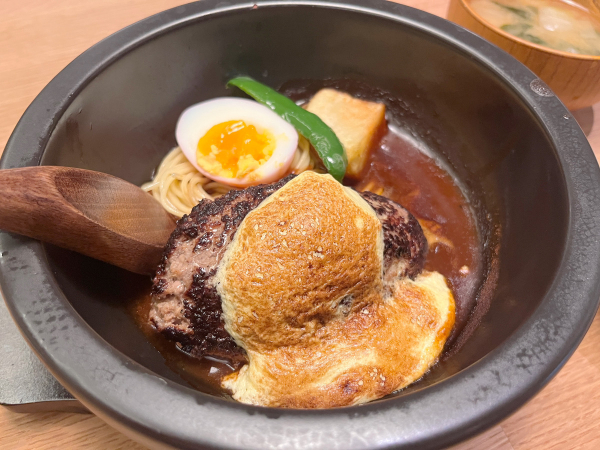 大きくて深い器にはハンバーグ、玉子、野菜。ハンバーグの下にはスパゲッティが隠れています。そしてたっぷりのデミグラスソース。ボリューム満点です。