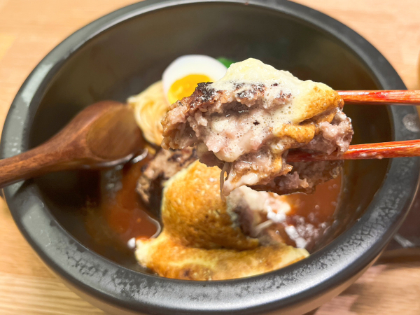 意外にもあっさり。ハンバーグは外側がしっかり焼かれていて、内側はふんわりと柔らかい。中に入っているチーズはクセもなく、クリーミーです。