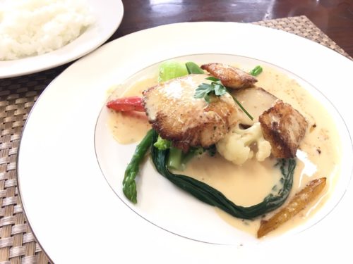 この日のお魚料理は、カレイのムニエル。ソースは生クリームと味噌を合せたもので、クリーミーでコクがあります。付け合わせの野菜もカリフラワーにアスパラ、パプリカ、スナップエンドウなど盛りだくさんで、地元の野菜を多めに使って、野菜不足を解消できるように考えられているとのこと。
