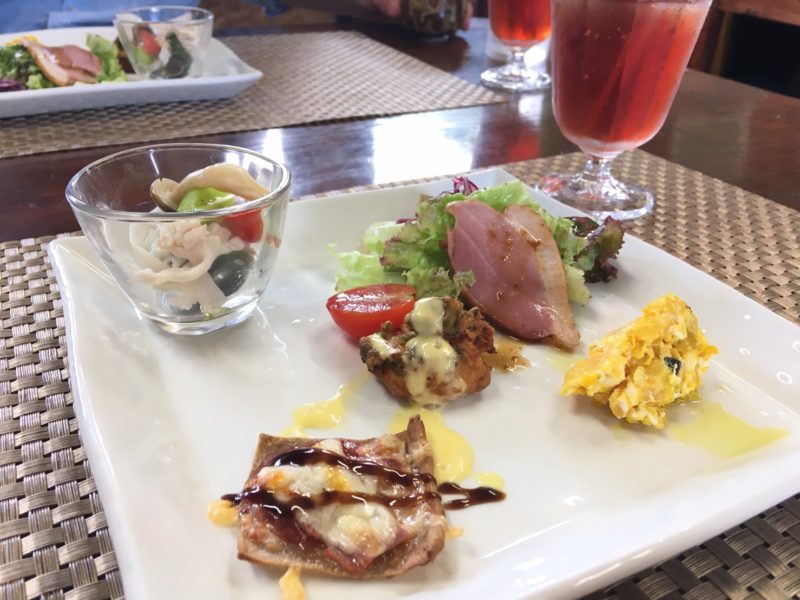 この日の前菜は、カモのスモーク、かぼちゃのチーズサラダ、豚肉と野菜のゆずごしょうドレッシングあえ、あおさとエビのフリット、そば粉ガレットの5種類。いろんな味が楽しめて、食べてみると、どれも本当に丁寧に作られていることがわかります。