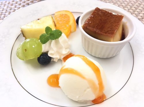プラス310円で追加できるデザートも…。この日のデザートは、地鶏の卵をたっぷり使ったクレームキャラメルにバニラアイス、フルーツがついたプレートでした。濃厚な手作りのクレームキャラメルも絶品!