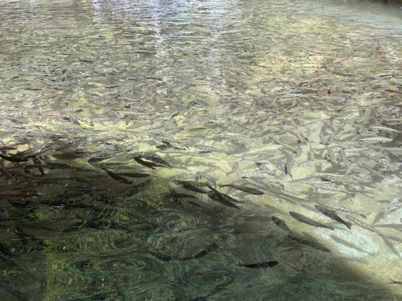 覗き込むと、たくさんのヤマメがうようよと泳いでいました。