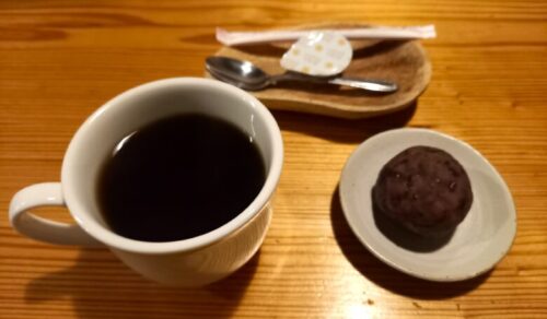 そしてデザートは、小豆から炊いた一口おはぎと、産山村の水でドリップしたコーヒー。