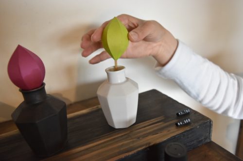 蕾のような可愛い形のアロマディフューザー「かぐわし」。精油のみのオイルが長崎の波佐見焼の器に注がれ、山鹿灯籠で使われる和紙が吸い上げてリラックス効果を与えてくれます。