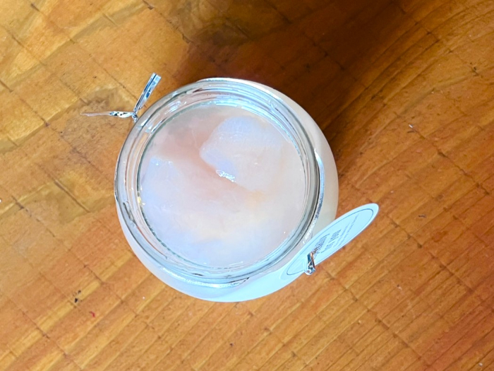 大きくカットされた桃がたっぷり入っています。甘さ控えめのプリンに爽やかなジュレが夏っぽいですね。
