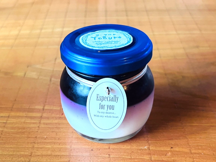 今度はこちらもフルーツをたっぷりと使った、ブルーペリーぷりん。このブルーペリーぷりんは、ヨーグルトプリンにブルーベリーのジュレが掛かっています。