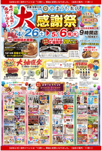 お得な情報といえば熊本の老舗味噌醤油店「やまうち本店」の大感謝祭が4月26日~5月6日まで開催されております。