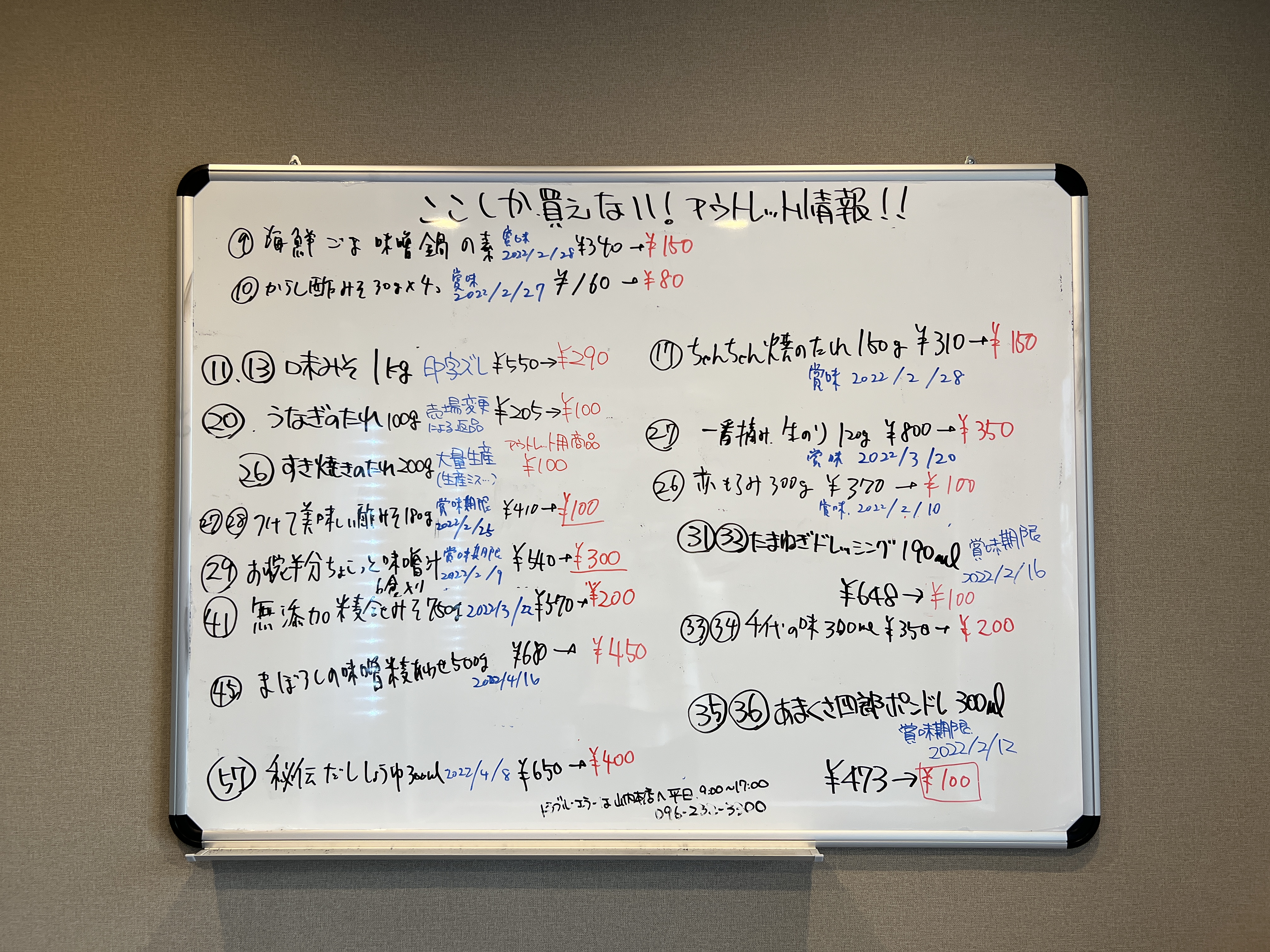 そして壁に設置してあるホワイトボードには、ラベル印字ズレや大量生産・賞味期限などのアウトレット情報が手書きで記載してあるので、ここにきたらぜひチェックしてみてください。さらに注目なのは、見てください!この価格!!よく見ると…税込100円や80円!?という100均よりもお買い得な商品まで存在します。