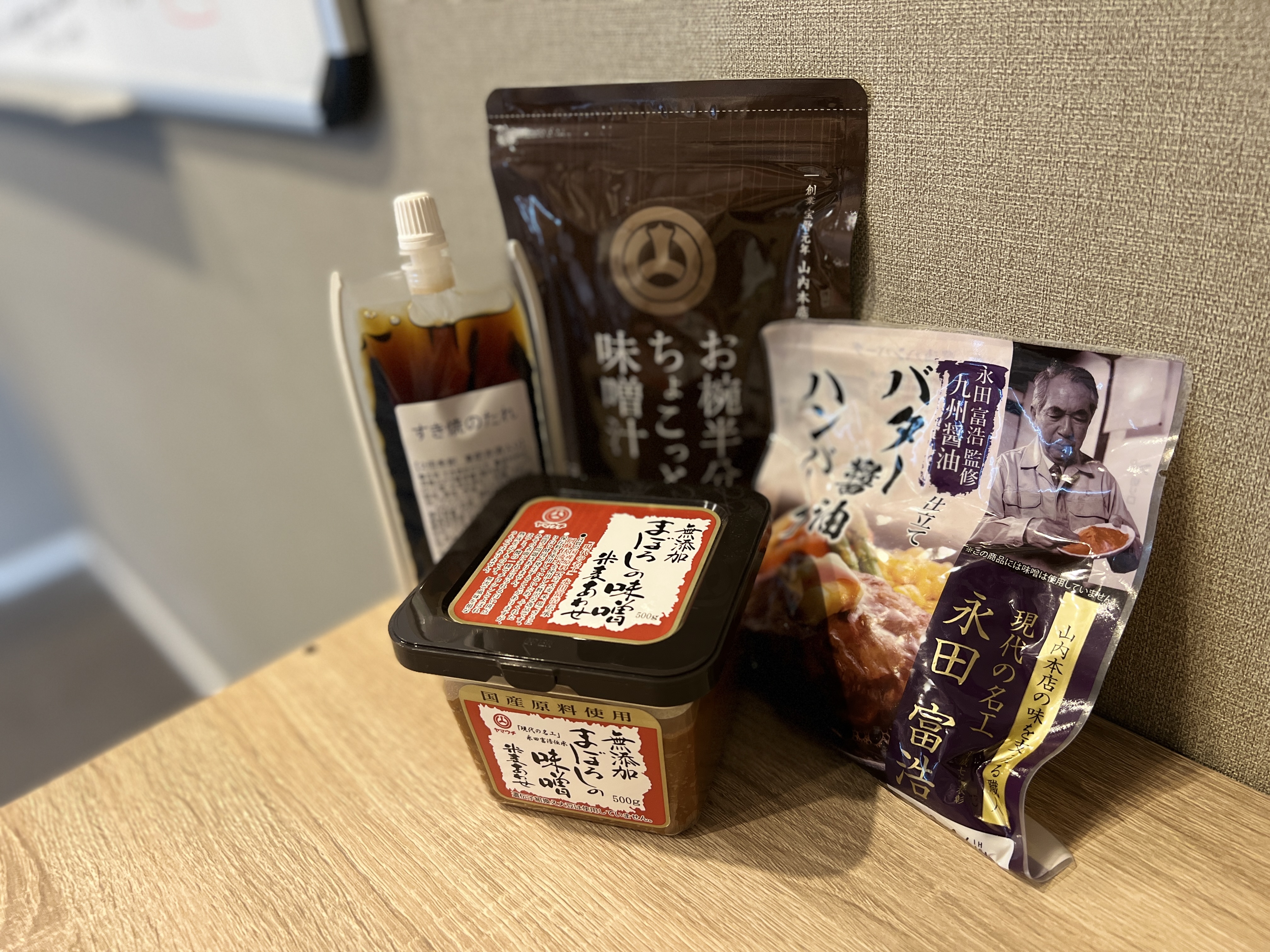 「九州醤油」や「まぼろしの味噌」を使用したレトルト食品に、アルコール不使用のフルーツ甘酒など珍しい商品なども含めて約50種類ほどの商品が販売されていました。