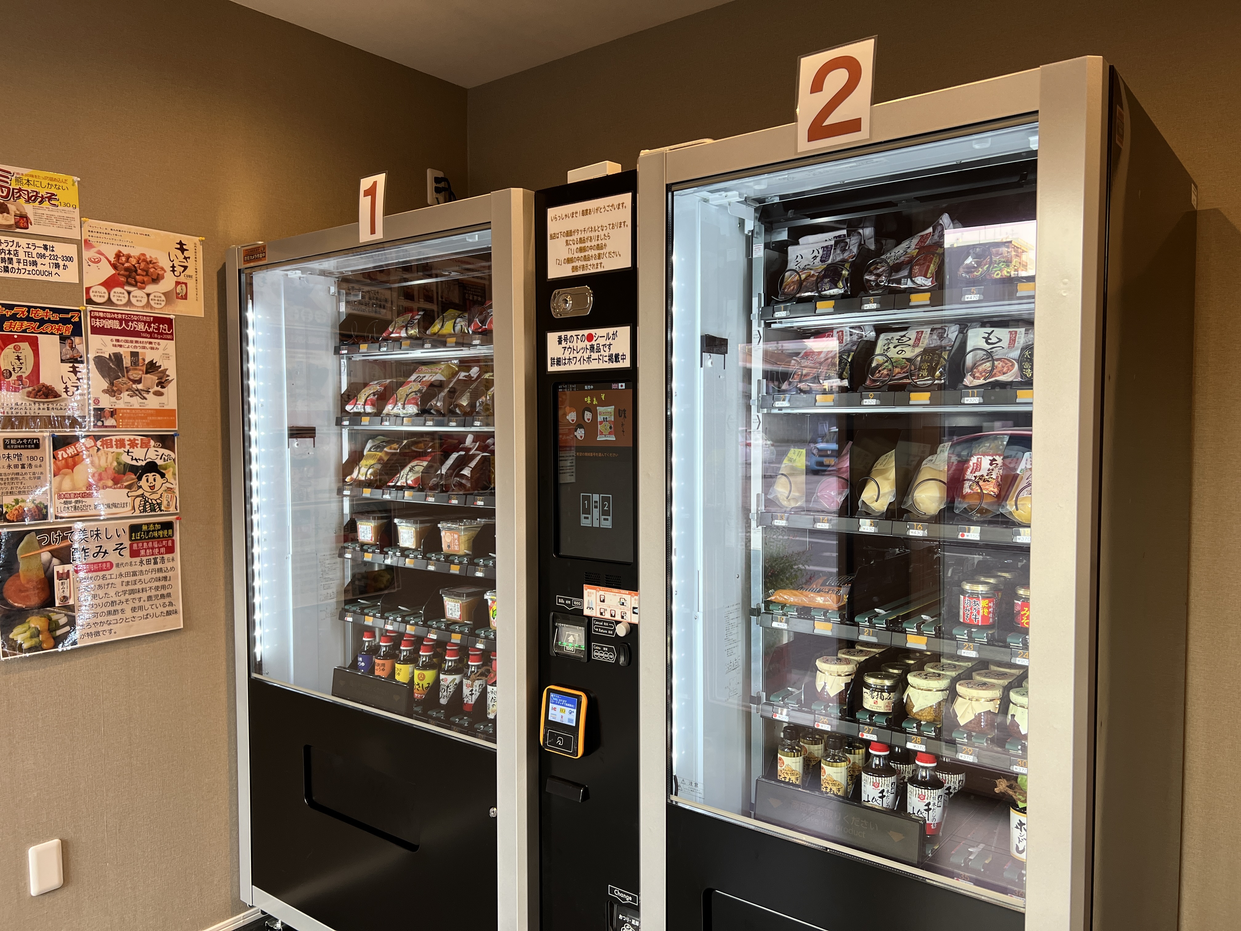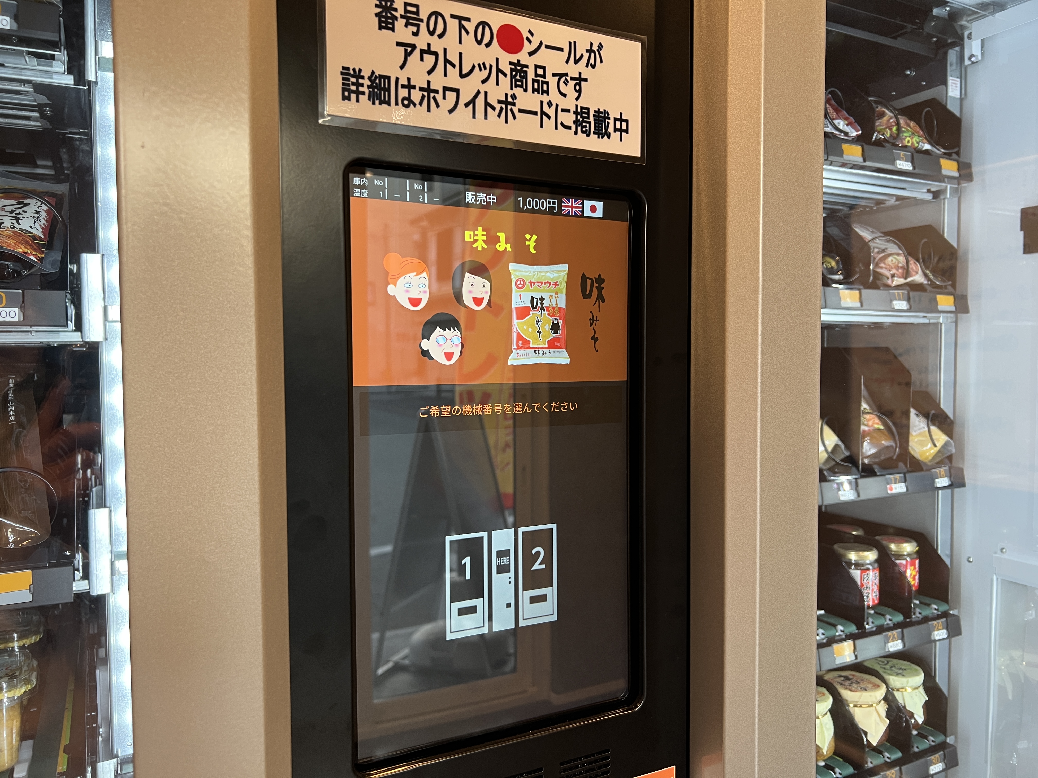 2台設置してある自動販売機には、番号の下に丸い赤いシールが貼ってある嬉しいアウトレット商品も。