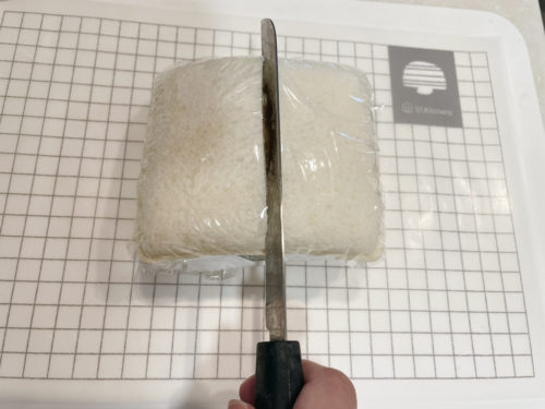 完成したら、ラップの上からパン切りナイフでまっすぐに切ります。