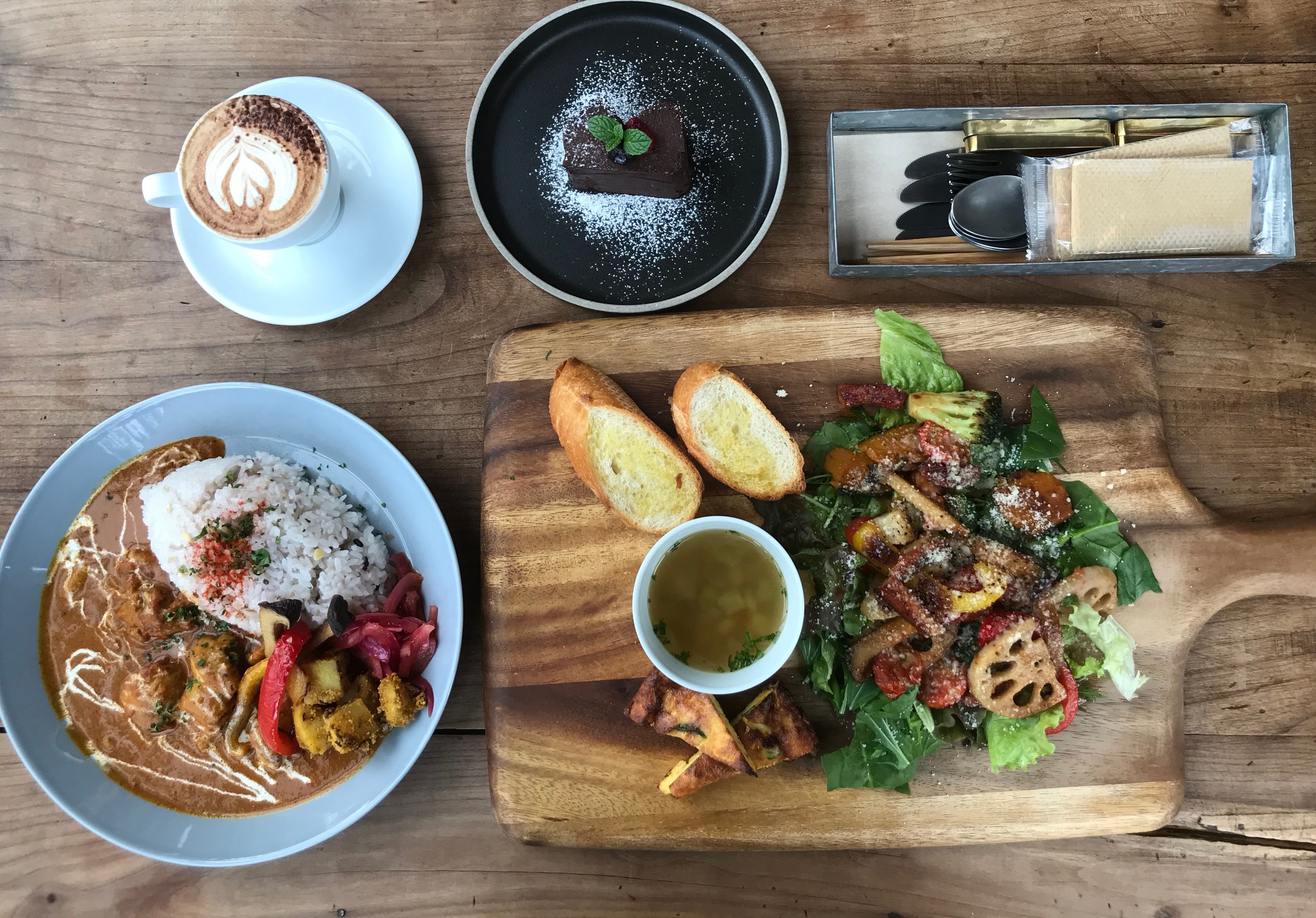 今回は王道であろう、ホットサラダとバターチキンカレー&デザート&ラテをチョイス。