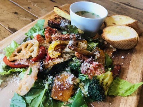 温野菜の中にベーコン。食感が異なる素材ばかりだから飽きずに堪能できる。そして体だけではなく心も温まるようなスープとバケット&キッシュ。