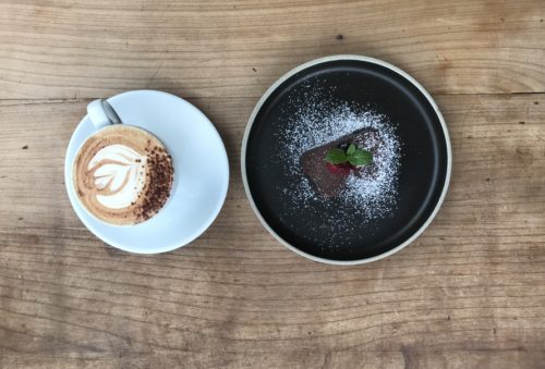 デザートはガトーショコラとラテ。つい、雰囲気に感化され「インスタ写真風」に撮ってしまった。