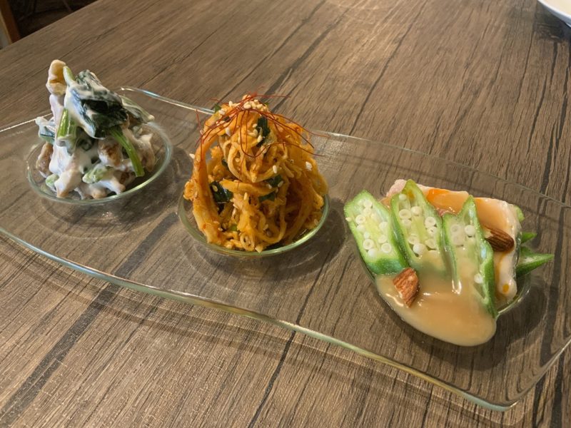 最初にやってきたのが、「おまかせ前菜3点盛り」。