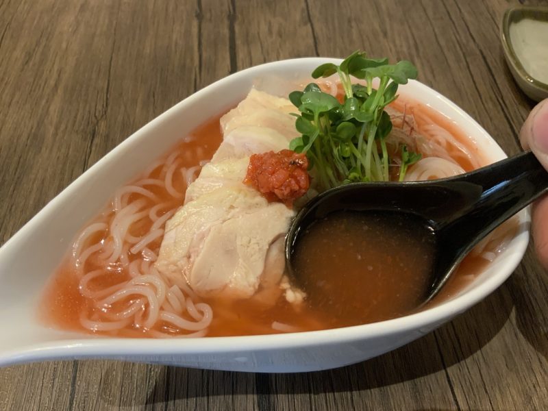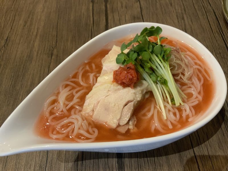 スープは梅干しの酸味がさっぱりしていて、冷麺と鶏肉との相性が良すぎる…。