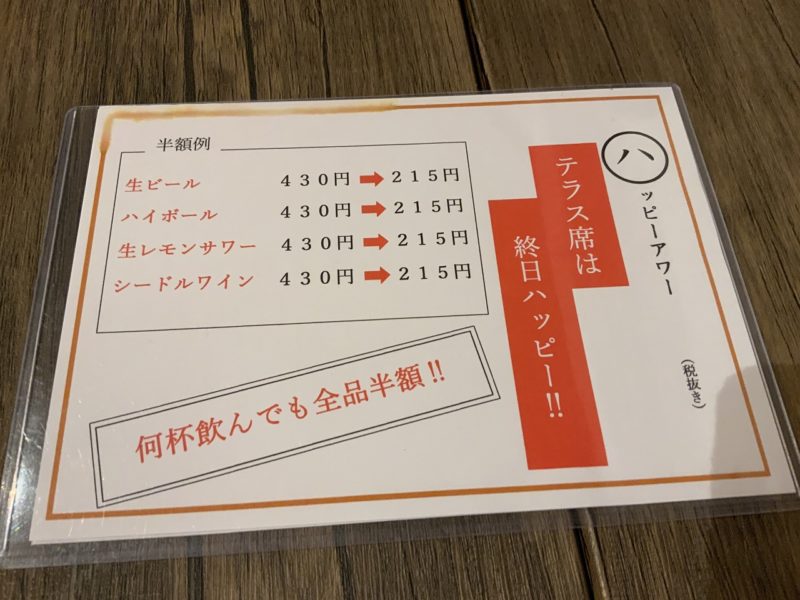 テラス席では、ドリンク半額というサービスも。元から安めの価格設定なのに、半額にして大丈夫なのでしょうか。