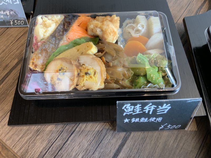 鮭弁当。銀鮭を使っているそうですが、他にもお惣菜が山ほど乗っています。もちろん、全部手作り。