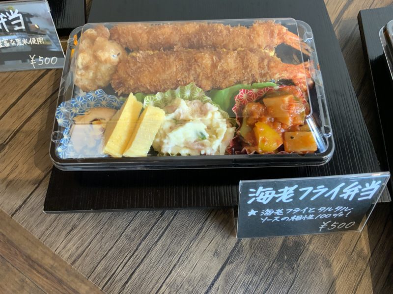 続いて海老フライ弁当。どでかい海老フライが2本乗って、弁当箱の半分を占拠しています。中のエビも大きくてぷりぷり。