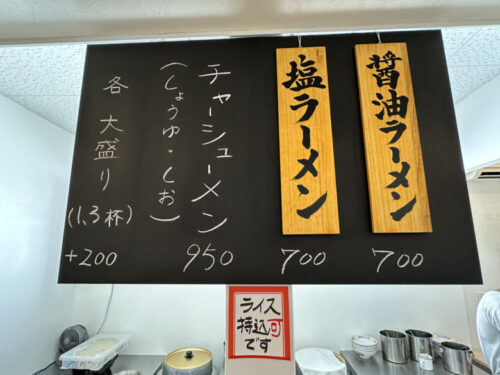 メニューはこちら。醤油ラーメン(700円)塩ラーメン(700円)どちらかのラーメンにチャーシューが多めに入っているチャーシュー麺(950円)と大盛(+200円)のみ。