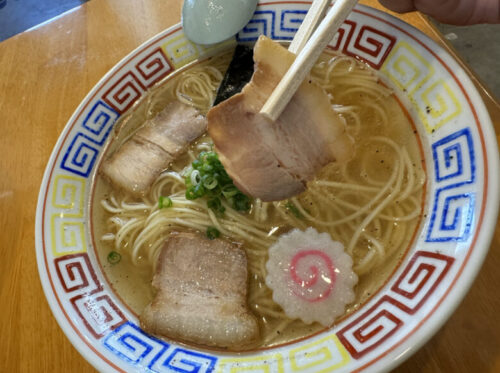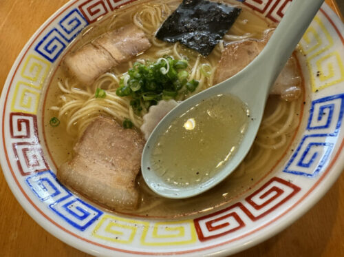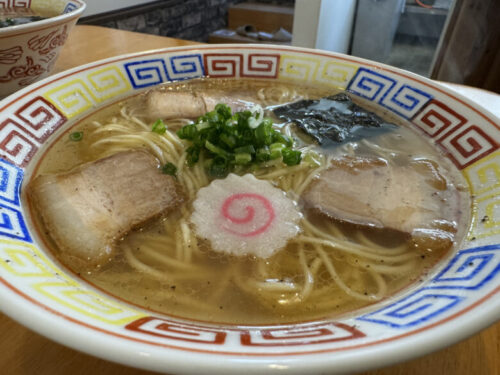こちらは塩ラーメン。チャーシューとナルト、海苔、ネギのみのシンプルなトッピング。