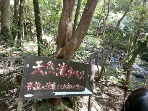 しばらく山を登っていくと、「天然滝すべり」の看板があるので、矢印方向の岩場へと降りていきます。